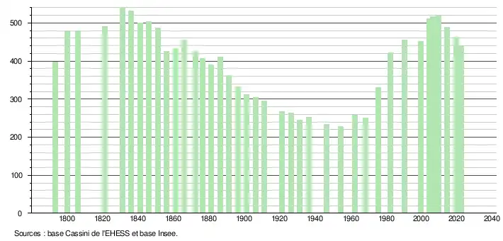 L'évolution du nombre d'habitants est connue à travers les recensements de la population effectués dans la commune depuis 1793. Pour les communes de moins de 10 000 habitants, une enquête de recensement portant sur toute la population est réalisée tous les cinq ans, les populations de référence des années intermédiaires étant quant à elles estimées par interpolation ou extrapolation[21]. Pour la commune, le premier recensement exhaustif entrant dans le cadre du nouveau dispositif a été réalisé en 2004[22].