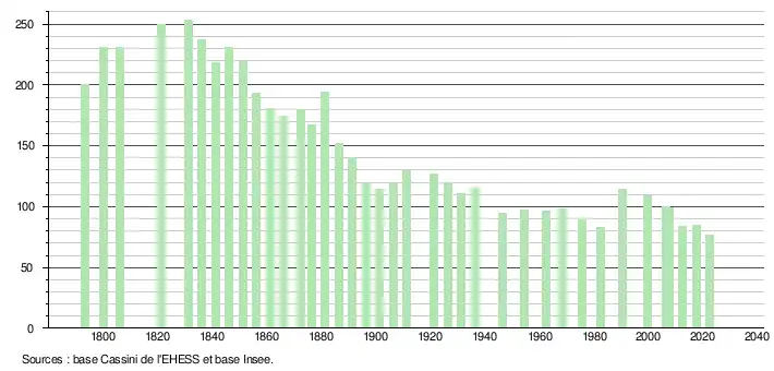 L'évolution du nombre d'habitants est connue à travers les recensements de la population effectués dans la commune depuis 1793. Pour les communes de moins de 10 000 habitants, une enquête de recensement portant sur toute la population est réalisée tous les cinq ans, les populations de référence des années intermédiaires étant quant à elles estimées par interpolation ou extrapolation[19]. Pour la commune, le premier recensement exhaustif entrant dans le cadre du nouveau dispositif a été réalisé en 2007[20].