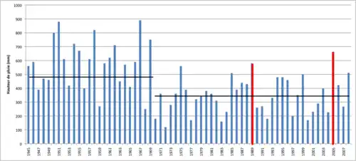 Le climat de la région est marqué par une saison des pluies entre juillet et septembre qui concentre la majorité des précipitations [5]. La figure 1 présente la pluviométrie annuelle caractérisée par une importante variabilité. On peut aussi remarquer une baisse des précipitations annuelles depuis la fin des années 1960.