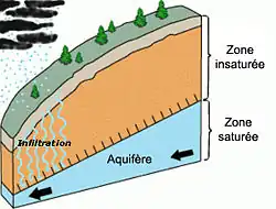 - la pollution de l'eau (qui peut en partie provenir de la pollution des sols et/ou de l'air) ; elle est fréquente sous les zones urbaines et industrielles, et sous les zones d'agriculture intensive pour les nitrates (qui peuvent aussi provenir d'eaux usées, dans les pays où les stations d'épuration ne les traitent pas, avec alors parfois aussi un risque de maladies infectieuses et parasitoses associé[6],[7],[8]) et pesticides. Forêts naturelles et prairies permanentes ont un effet protecteur sur les nappes sous-jacentes alors que le labour, l'urbanisation et l'industrialisation nuisent à la qualité et parfois à la recharge des nappes.