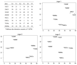 - Une représentation des dégustateurs indiquant l'importance que chacun d'eux a accordée aux dimensions de la représentation moyenne. On reconnaît là le modèle INDSCAL. Selon ce point de vue, l'AFM fournit une estimation de ses paramètres.