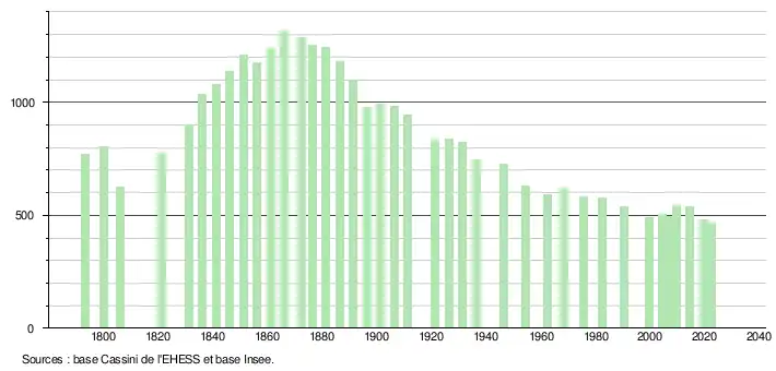 L'évolution du nombre d'habitants est connue à travers les recensements de la population effectués dans la commune depuis 1793. Pour les communes de moins de 10 000 habitants, une enquête de recensement portant sur toute la population est réalisée tous les cinq ans, les populations de référence des années intermédiaires étant quant à elles estimées par interpolation ou extrapolation[24]. Pour la commune, le premier recensement exhaustif entrant dans le cadre du nouveau dispositif a été réalisé en 2004[25].