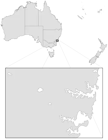 La carte ci-contre indique la localisation des franchises actuelles opérant dans la NRL, en haut sont représentées l'Australie et la Nouvelle-Zélande, en bas la zone urbaine de Sydney.