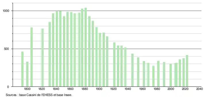 L'évolution du nombre d'habitants est connue à travers les recensements de la population effectués dans la commune depuis 1793. Pour les communes de moins de 10 000 habitants, une enquête de recensement portant sur toute la population est réalisée tous les cinq ans, les populations de référence des années intermédiaires étant quant à elles estimées par interpolation ou extrapolation[46]. Pour la commune, le premier recensement exhaustif entrant dans le cadre du nouveau dispositif a été réalisé en 2007[47].