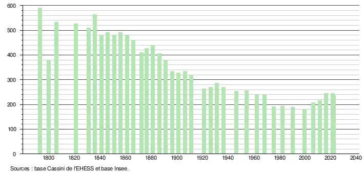 L'évolution du nombre d'habitants est connue à travers les recensements de la population effectués dans la commune depuis 1793. Pour les communes de moins de 10 000 habitants, une enquête de recensement portant sur toute la population est réalisée tous les cinq ans, les populations de référence des années intermédiaires étant quant à elles estimées par interpolation ou extrapolation[50]. Pour la commune, le premier recensement exhaustif entrant dans le cadre du nouveau dispositif a été réalisé en 2006[51].