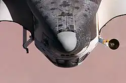 - l'orbiteur, doté d'ailes et d'un empennage qui lui permet de revenir au sol comme un planeur et est recouvert d'un bouclier thermique lui permettant de résister aux températures rencontrées durant la rentrée atmosphérique. Son rôle est de transporter l'équipage et la charge utile en orbite, puis de revenir sur le sol avec son équipage et éventuellement avec un fret au retour. C'est l'élément central de la navette spatiale et on y trouve les trois moteurs SSME permettant de placer la navette en orbite ;