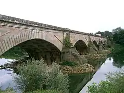 - Pont de Navilly sur le Doubs[21],[22] : il a été construit sur le Doubs à la fin du XVIIIe siècle, de 1782/1785 à 1790, sur des plans de Émiland Gauthey. Ce pont-route, sur la RN 73 entre Dole et Chalon-sur-Saône, comporte 5 arches et a une portée totale de 156 mètres. Endommagé pendant la guerre en 1944 et fragilisé par l'extraction de granulat dans le lit de la rivière, il a été plusieurs fois conforté pour résister aux crues du Doubs et à l'importante circulation des poids lourds. Il servait de point de passage de la ligne de démarcation et a été le lieu de l'exécution raciste d'un soldat sénégalais le par l'armée allemande comme le rappelle une plaque apposée à proximité.