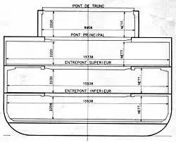 Historiquement, ces navires possédaient quatre cales, car les dockers venaient en quatre équipes pour le déchargement ; ces cales devaient aussi être de taille similaire, pour garder des horaires proches entre les équipes. Le plancher des cales est en général recouvert d'un isolant, historiquement en bois, et maintenant en aluminium, plus pratique pour le nettoyage et la circulation des chariots élévateurs. L'isolant occupe une hauteur de 13 à 16 centimètres. Les ponts ont une hauteur de 2,20 mètres (du sol jusqu'à la limite inférieure des renforts), afin de pouvoir laisser passer les palettes.