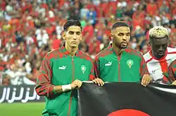 Repéré par le sélectionneur français Hervé Renard, il dispute son premier match en équipe du Maroc le , en amical contre l'Albanie dans un match qui se solde par un score de 0-0 au Stade Loro-Boriçi à Shkodër[55]. Lors de ce match, un autre jeune joueur qui est testé pour la première fois est Ryan Mmaee[56]. À l'occasion des qualifications à la Coupe du monde 2018 disputée en Russie, il voit ses chances de participer à la compétition s'envoler à cause de la concurrence palpitante dans la défense centrale qu'occupent Mehdi Benatia, Romain Saïss et Manuel da Costa.