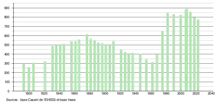 L'évolution du nombre d'habitants est connue à travers les recensements de la population effectués dans la commune depuis 1793. Pour les communes de moins de 10 000 habitants, une enquête de recensement portant sur toute la population est réalisée tous les cinq ans, les populations de référence des années intermédiaires étant quant à elles estimées par interpolation ou extrapolation[24]. Pour la commune, le premier recensement exhaustif entrant dans le cadre du nouveau dispositif a été réalisé en 2007[25].