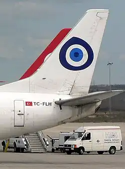 Le symbole de nazar boncuk a été utilisé comme logotype sur la dérive des avions appartenant à la compagnie privée turque Fly Air.