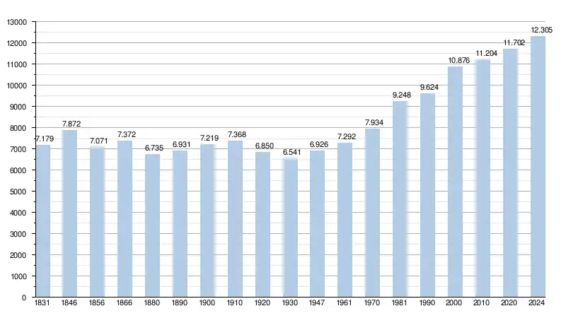 Graphe de l'évolution de la population de la commune. Les données ci-après intègrent les anciennes communes dans les données avant la fusion en 1977.