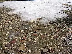 Sur certaines étendues de vieille neige comme les glaciers, la neige peut prendre une coloration rouge ochracé nommée sang des glaciers. Il s'agit d'une efflorescence algale causée par des algues vertes composées de chlorophylle et de pigments rouges ou orange. Plusieurs espèces sont à l'origine de ce phénomène, la principale étant Chlamydomonas nivalis[42].