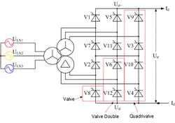 Les valves sont organisées en trois quadrivalves : une par phase. Chaque valve est constituée de 96 thyristors en série répartis en 16 modules, 91 sont nécessaires pour un fonctionnement normal. Par ailleurs chaque valve dispose également de 8 modules réactifs[4].