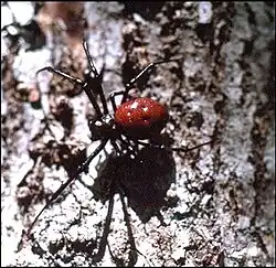 Les mâles de cette espèce sont de petite taille et vivent en commensaux sur les toiles des femelles[4].