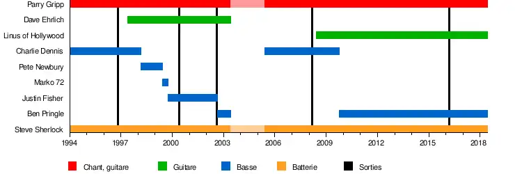- Charlie Dennis – basse, chant (1994–1998, 2005–2009)