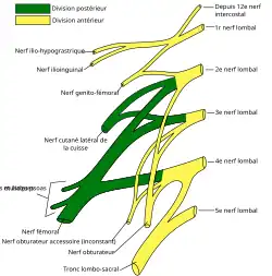 Au-dessus de l'épine iliaque antéro-supérieure, après avoir donné un rameau collatéral sensitif, il se divise un rameau cutané latéral et un rameau cutané antérieur.