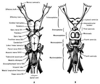 Chez l'être humain, le nerf terminal, composé de fibres plexiformes ganglionnaires, passe depuis la base du crâne par la fente ethmoïdale avant de cheminer vers le bas et l’avant de la cloison nasale pour se terminer en avant de l'organe voméro-nasal[1]. De manière générale, chez les vertébrés, le nerf terminal se compose d'un ganglion souvent proche de l'épithélium olfactif, avec des neurones bipolaires reliés à la fois à cet épithélium et au cerveau. Les neurones du nerf terminal contiennent des peptides tels que le GnRH et le FMRFamide, laissant supposer une fonction neuromodulatrice [2]