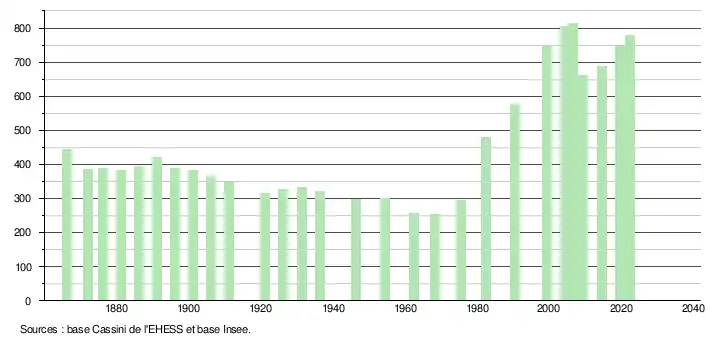 L'évolution du nombre d'habitants est connue à travers les recensements de la population effectués dans la commune depuis 1866. Pour les communes de moins de 10 000 habitants, une enquête de recensement portant sur toute la population est réalisée tous les cinq ans, les populations de référence des années intermédiaires étant quant à elles estimées par interpolation ou extrapolation[21]. Pour la commune, le premier recensement exhaustif entrant dans le cadre du nouveau dispositif a été réalisé en 2004[22].