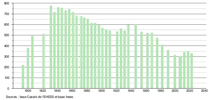 L'évolution du nombre d'habitants est connue à travers les recensements de la population effectués dans la commune depuis 1793. Pour les communes de moins de 10 000 habitants, une enquête de recensement portant sur toute la population est réalisée tous les cinq ans, les populations de référence des années intermédiaires étant quant à elles estimées par interpolation ou extrapolation[36]. Pour la commune, le premier recensement exhaustif entrant dans le cadre du nouveau dispositif a été réalisé en 2007[37].