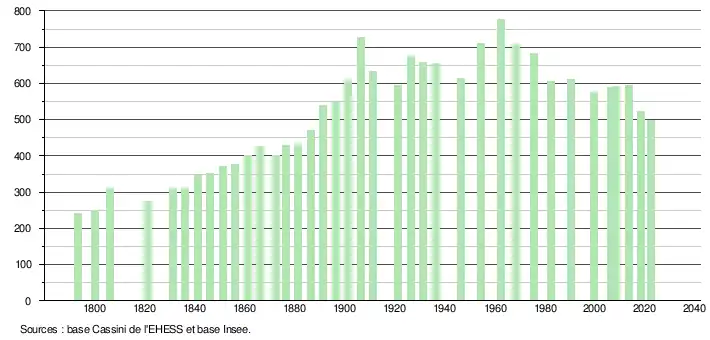 L'évolution du nombre d'habitants est connue à travers les recensements de la population effectués dans la commune depuis 1793. Pour les communes de moins de 10 000 habitants, une enquête de recensement portant sur toute la population est réalisée tous les cinq ans, les populations de référence des années intermédiaires étant quant à elles estimées par interpolation ou extrapolation[32]. Pour la commune, le premier recensement exhaustif entrant dans le cadre du nouveau dispositif a été réalisé en 2008[33].