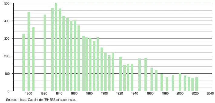 L'évolution du nombre d'habitants est connue à travers les recensements de la population effectués dans la commune depuis 1793. Pour les communes de moins de 10 000 habitants, une enquête de recensement portant sur toute la population est réalisée tous les cinq ans, les populations de référence des années intermédiaires étant quant à elles estimées par interpolation ou extrapolation[13]. Pour la commune, le premier recensement exhaustif entrant dans le cadre du nouveau dispositif a été réalisé en 2006[14].