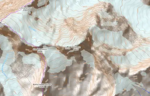 Le Netshorn est entouré au nord-est par le glacier du Nesthorn (Nesthorngletscher), au nord par le glacier du Beitsch (Beitschgletscher) et au sud par le glacier du Gredetsch (Gredetschgletscher).