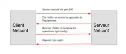 Lorsqu'un client initie une connexion ssh avec un serveur Netconf, le serveur envoie un message avec la liste des modules présents sur l'équipement et attend le retour du client avant de pouvoir entamer les procédures de configuration et gestion.