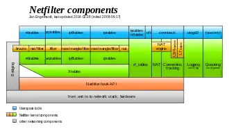 Netfilter est un cadriciel (framework) implémentant un pare-feu au sein du noyau Linux à partir de la version 2.4 de ce dernier. Il prévoit des accroches (hooks) dans le noyau pour l'interception et la manipulation des paquets réseau lors des appels des routines de réception ou d'émission des paquets des interfaces réseau.