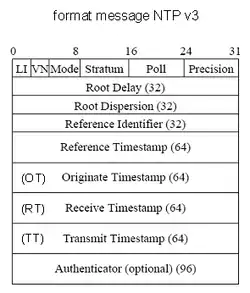 Le message de demande d'heure envoyé par un client vers un serveur et celui pour la réponse ont la même structure. Celle-ci est schématisée ci-dessous, elle correspond à la version 3 de NTP, mais le principe général décrit ci-dessous est conservé au fil des versions; les informations principales utilisées dans ce message pour calculer les écarts d'heure entre client et serveur sont les suivantes :