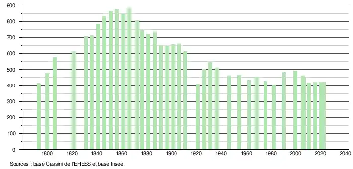 L'évolution du nombre d'habitants est connue à travers les recensements de la population effectués dans la commune depuis 1793. Pour les communes de moins de 10 000 habitants, une enquête de recensement portant sur toute la population est réalisée tous les cinq ans, les populations de référence des années intermédiaires étant quant à elles estimées par interpolation ou extrapolation[28]. Pour la commune, le premier recensement exhaustif entrant dans le cadre du nouveau dispositif a été réalisé en 2005[29].
