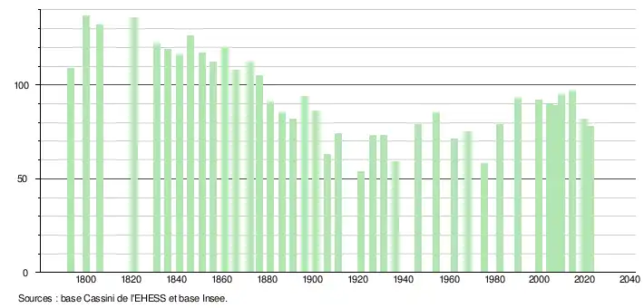L'évolution du nombre d'habitants est connue à travers les recensements de la population effectués dans la commune depuis 1793. Pour les communes de moins de 10 000 habitants, une enquête de recensement portant sur toute la population est réalisée tous les cinq ans, les populations de référence des années intermédiaires étant quant à elles estimées par interpolation ou extrapolation[23]. Pour la commune, le premier recensement exhaustif entrant dans le cadre du nouveau dispositif a été réalisé en 2004[24].