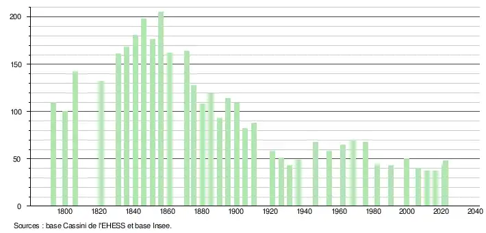 L'évolution du nombre d'habitants est connue à travers les recensements de la population effectués dans la commune depuis 1793. Pour les communes de moins de 10 000 habitants, une enquête de recensement portant sur toute la population est réalisée tous les cinq ans, les populations de référence des années intermédiaires étant quant à elles estimées par interpolation ou extrapolation[16]. Pour la commune, le premier recensement exhaustif entrant dans le cadre du nouveau dispositif a été réalisé en 2006[17].
