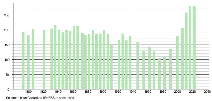 L'évolution du nombre d'habitants est connue à travers les recensements de la population effectués dans la commune depuis 1793. Pour les communes de moins de 10 000 habitants, une enquête de recensement portant sur toute la population est réalisée tous les cinq ans, les populations de référence des années intermédiaires étant quant à elles estimées par interpolation ou extrapolation[23]. Pour la commune, le premier recensement exhaustif entrant dans le cadre du nouveau dispositif a été réalisé en 2006[24].