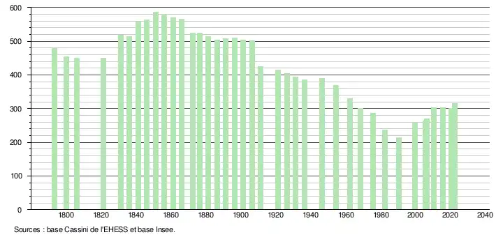 L'évolution du nombre d'habitants est connue à travers les recensements de la population effectués dans la commune depuis 1793. Pour les communes de moins de 10 000 habitants, une enquête de recensement portant sur toute la population est réalisée tous les cinq ans, les populations de référence des années intermédiaires étant quant à elles estimées par interpolation ou extrapolation[14]. Pour la commune, le premier recensement exhaustif entrant dans le cadre du nouveau dispositif a été réalisé en 2005[15].