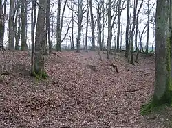 - une troisième motte, située près du domaine des Jollards, était encore entourée de ses fossés plein d'eau à la fin du XIXe siècle : la motte ou butte Jollard. Il s'agissait d'une maison forte de forme rectangulaire avec des dimensions de 35 m de long et de 25 m de large, des fossés de 8 m de large et 3 m de profondeur. Une partie de la terre des fossés a permis d'édifier la butte, haute de 2,50 m[21]. Il pourrait s'agir à l'origine d'un ancien camp romain installé à proximité d'une voie romaine reliant Macon à Bordeaux. En effet à la fin du XIXe siècle, une tranchée fut creusée et permis la découverte d'éléments gallo-romains provenant d'un habitat de l'époque[22]. Elle se situe en lisière de bois, au nord-est du lieu-dit des Jollards. Ce domaine possédait également une maison bourgeoise, propriété, à la fin du XVIIe siècle, des Grimaud de Servé (fief de la paroisse de Saint-Voir).