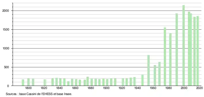 L'évolution du nombre d'habitants est connue à travers les recensements de la population effectués dans la commune depuis 1793. Pour les communes de moins de 10 000 habitants, une enquête de recensement portant sur toute la population est réalisée tous les cinq ans, les populations de référence des années intermédiaires étant quant à elles estimées par interpolation ou extrapolation[3]. Pour la commune, le premier recensement exhaustif entrant dans le cadre du nouveau dispositif a été réalisé en 2008[4].