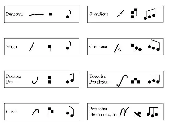 Les neumes essentiels (quatre neumes à gauche) sont[9] :