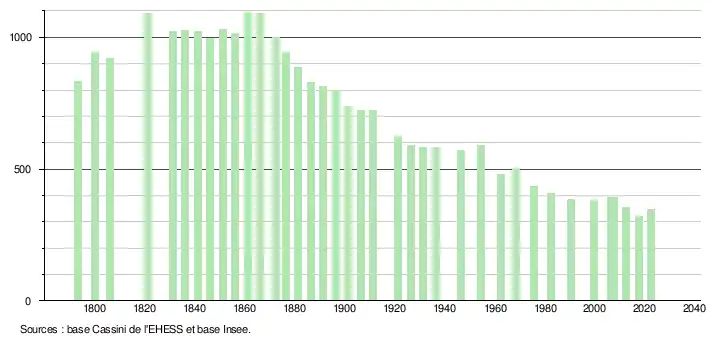 L'évolution du nombre d'habitants est connue à travers les recensements de la population effectués dans la commune depuis 1793. Pour les communes de moins de 10 000 habitants, une enquête de recensement portant sur toute la population est réalisée tous les cinq ans, les populations de référence des années intermédiaires étant quant à elles estimées par interpolation ou extrapolation[17]. Pour la commune, le premier recensement exhaustif entrant dans le cadre du nouveau dispositif a été réalisé en 2007[18].