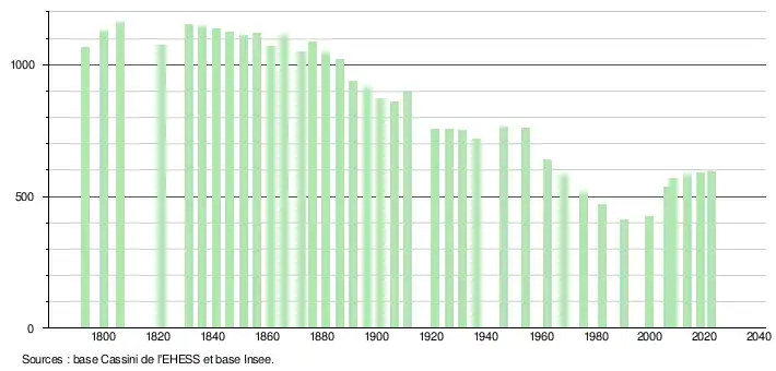 L'évolution du nombre d'habitants est connue à travers les recensements de la population effectués dans la commune depuis 1793. Pour les communes de moins de 10 000 habitants, une enquête de recensement portant sur toute la population est réalisée tous les cinq ans, les populations de référence des années intermédiaires étant quant à elles estimées par interpolation ou extrapolation[18]. Pour la commune, le premier recensement exhaustif entrant dans le cadre du nouveau dispositif a été réalisé en 2008[19].