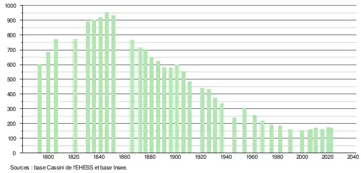 L'évolution du nombre d'habitants est connue à travers les recensements de la population effectués dans la commune depuis 1793. Pour les communes de moins de 10 000 habitants, une enquête de recensement portant sur toute la population est réalisée tous les cinq ans, les populations de référence des années intermédiaires étant quant à elles estimées par interpolation ou extrapolation[27]. Pour la commune, le premier recensement exhaustif entrant dans le cadre du nouveau dispositif a été réalisé en 2005[28].