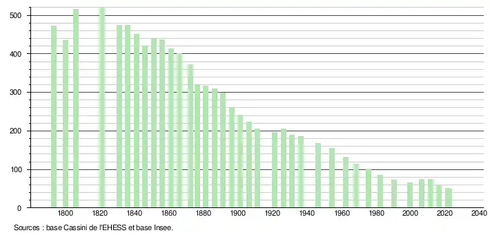 L'évolution du nombre d'habitants est connue à travers les recensements de la population effectués dans la commune depuis 1793. Pour les communes de moins de 10 000 habitants, une enquête de recensement portant sur toute la population est réalisée tous les cinq ans, les populations de référence des années intermédiaires étant quant à elles estimées par interpolation ou extrapolation[19]. Pour la commune, le premier recensement exhaustif entrant dans le cadre du nouveau dispositif a été réalisé en 2006[20].