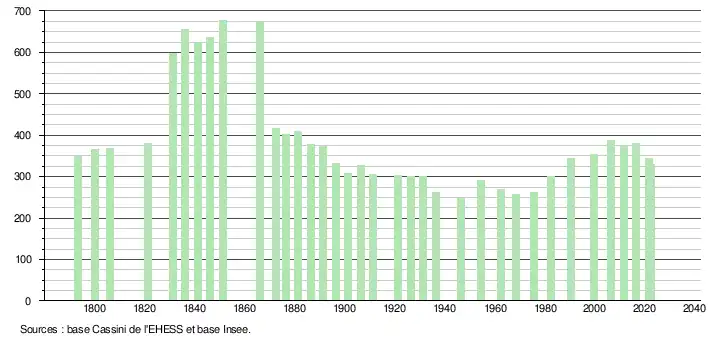 L'évolution du nombre d'habitants est connue à travers les recensements de la population effectués dans la commune depuis 1793. Pour les communes de moins de 10 000 habitants, une enquête de recensement portant sur toute la population est réalisée tous les cinq ans, les populations de référence des années intermédiaires étant quant à elles estimées par interpolation ou extrapolation[21]. Pour la commune, le premier recensement exhaustif entrant dans le cadre du nouveau dispositif a été réalisé en 2006[22].