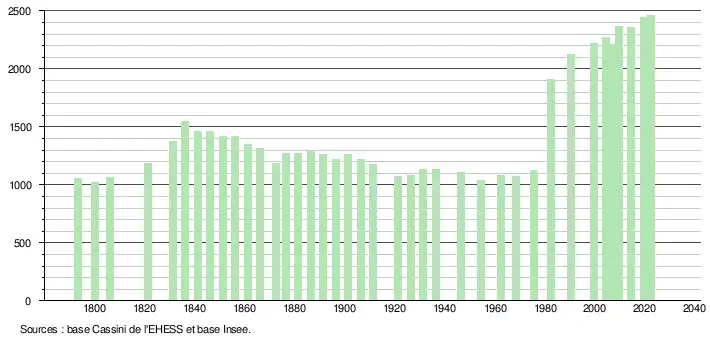 L'évolution du nombre d'habitants est connue à travers les recensements de la population effectués dans la commune depuis 1793. Pour les communes de moins de 10 000 habitants, une enquête de recensement portant sur toute la population est réalisée tous les cinq ans, les populations de référence des années intermédiaires étant quant à elles estimées par interpolation ou extrapolation[19]. Pour la commune, le premier recensement exhaustif entrant dans le cadre du nouveau dispositif a été réalisé en 2004[20].