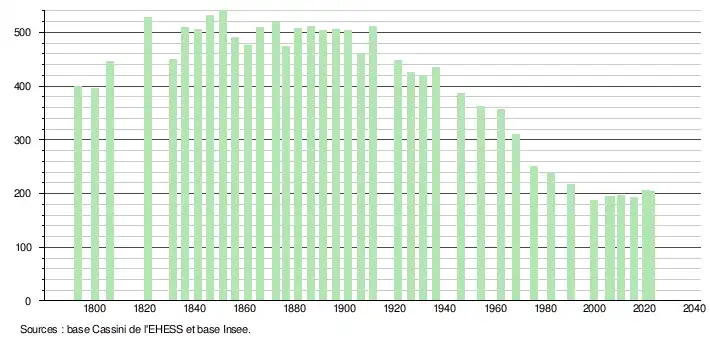 L'évolution du nombre d'habitants est connue à travers les recensements de la population effectués dans la commune depuis 1793. Pour les communes de moins de 10 000 habitants, une enquête de recensement portant sur toute la population est réalisée tous les cinq ans, les populations de référence des années intermédiaires étant quant à elles estimées par interpolation ou extrapolation[23]. Pour la commune, le premier recensement exhaustif entrant dans le cadre du nouveau dispositif a été réalisé en 2005[24].