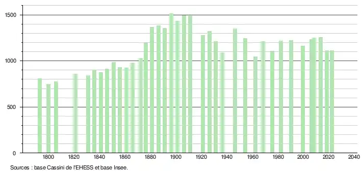 L'évolution du nombre d'habitants est connue à travers les recensements de la population effectués dans la commune depuis 1793. Pour les communes de moins de 10 000 habitants, une enquête de recensement portant sur toute la population est réalisée tous les cinq ans, les populations de référence des années intermédiaires étant quant à elles estimées par interpolation ou extrapolation[25]. Pour la commune, le premier recensement exhaustif entrant dans le cadre du nouveau dispositif a été réalisé en 2008[26].