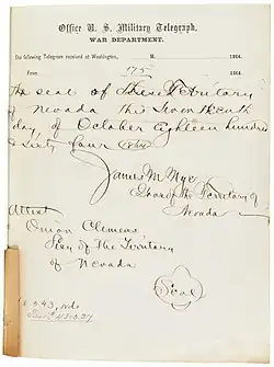 Le territoire du Nevada est de courte durée, cependant, son entrée comme État des États-Unis s'accélère en 1864. Le président Abraham Lincoln demande le soutien d’un État du Nord supplémentaire qui voterait probablement pour sa réélection et aiderait à forcer les idées pro-nordistes pour les nouveaux amendements à la Constitution des États-Unis, en particulier le 13e amendement, par lequel il propose d'abolir l'esclavage. Les sympathisants unionistes sont si désireux d'obtenir le statut d'État pour le Nevada qu’ils s'empressent d’envoyer toute la constitution de l’État par télégraphe au Congrès des États-Unis avant l’élection présidentielle des États-Unis de 1864, car ils pensent que l'envoi par train ne garantirait pas son arrivée à temps. La constitution est envoyée les -[2], moins de deux semaines avant l'élection du . La transmission prend deux jours ; elle comprend 16 543 mots et coûte 4 303,27 $[note 1] (5 784 $[3] actuels) à envoyer[2]. C'est, à l'époque, la plus longue transmission télégraphique jamais réalisée, un record qu'elle a conservé pendant dix-sept ans jusqu'à ce qu'une copie de la « version révisée du Nouveau Testament » de 118 000 mots soit envoyée par télégraphe le [4],[5].