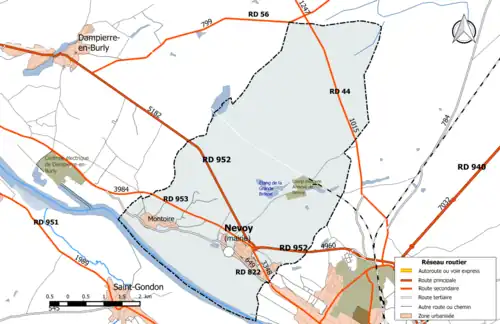 La commune de Nevoy se trouve dans le quadrant sud-est du département du Loiret, dans la région agricole de l'Orléanais[2]. À vol d'oiseau, elle se situe à 54,8 km d'Orléans[3], préfecture du département, à 34,1 km de Montargis[4], sous-préfecture, et à 4,2 km de Gien, ancien chef-lieu du canton dont dépendait la commune avant mars 2015. La commune fait partie du bassin de vie de Gien[5].