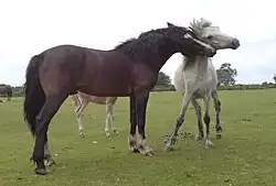 Des poneys vivent en semi-liberté toute l'année dans le parc national New Forest. La grande majorité sont des juments, on trouve aussi quelques hongres. Durant la plus grande partie de l'année, ces animaux vivent en petits groupes composés d'une jument âgée, de ses descendantes et de leurs poulains, restant principalement dans une zone discrète de la forêt poétiquement appelée haunt (« repaire »). Selon la loi du parc national, les juments et les hongres peuvent être de toutes races. La plupart sont des New Forest, mais d'autres races comme le poney Shetland et des animaux issus de croisements peuvent être présents dans certaines zones[41]. Les étalons doivent impérativement être des New Forest pleins papiers (inscrits au stud-book) et ne sont pas autorisés à vivre librement en forêt toute l'année. Un petit nombre (généralement moins de 50) y est en général lâché[42] pour une période limitée, habituellement entre mai et août, ce qui évite aux juments d'avoir leurs poulains trop tôt (avant la poussée de l'herbe de printemps) ou trop tard (quand le temps refroidit et l'herbe meurt) l'année suivante. Ils réunissent alors plusieurs groupes de juments et de jeunes chevaux dans de grands troupeaux et les défendent contre les autres étalons.