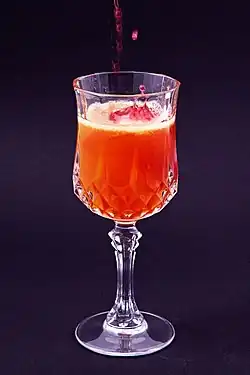 | Préparation | Mélanger les ingrédients au shaker, colorer au vin rouge |